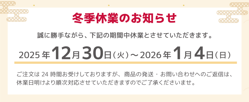 更新情報 年末年始休業のお知らせ 2025年12月22日 / 年末年始休業のお知らせとなります 12月30日(火)~ 1月4日(日) は 誠に勝手ながら年末年始休業となります。 年内の最終出荷は12月29日(月)を予定しております。 また、年明けは1月5日(月)より順次出荷とさせていただきます。 詳細はお問い合わせください。 なお、連休前後は受注が集中し配送の混雑が予想されます。 出来るだけ納期に余裕をもってお早めにご注文頂ますよう、お願い申し上げます。